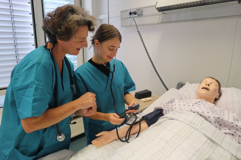 So kann man beispielsweise an der Nursing Anne wichtige Pflegetechniken wie Spritzen setzen, Blasenkatheter legen oder Verbände wechseln durchführen. Das sichert die Fertigkeiten bei den Auszubildenden, ohne dass diese Angst haben, müssen Patienten zu verletzen.